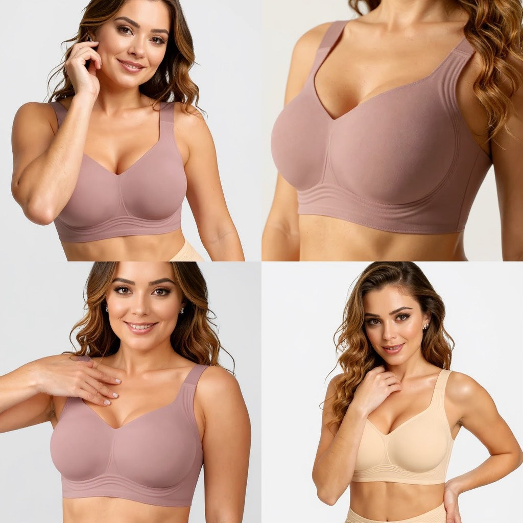 The Décolleté Bra is the only wireless bra designed with this 'Liquid-Hug' technology, created to give you a dramatic, lifted plunge silhouette with zero poking, prodding, or pain. This system uses a W-shaped gel ribbon that flexes with your every move while providing incredible lift and centralization. Combined with a seamless, buttery-soft fabric, it gives you a flawless, confident look with a level of comfort so sublime, you'll forget you're wearing it.